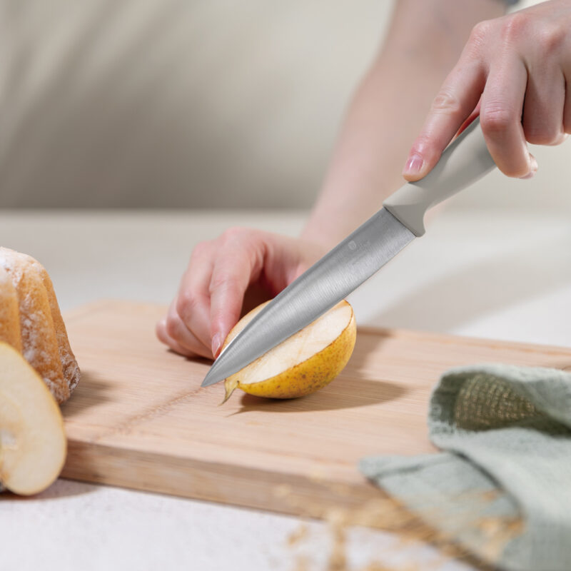 Knivene har ergonomiske Soft Touch-håndtak som gir et sikkert og behagelig grep. Den matte kremfargen gir et eksklusivt uttrykk som passer i alle kjøkken.