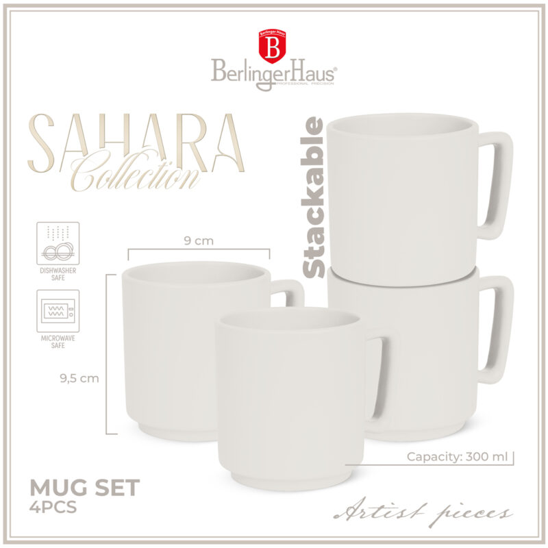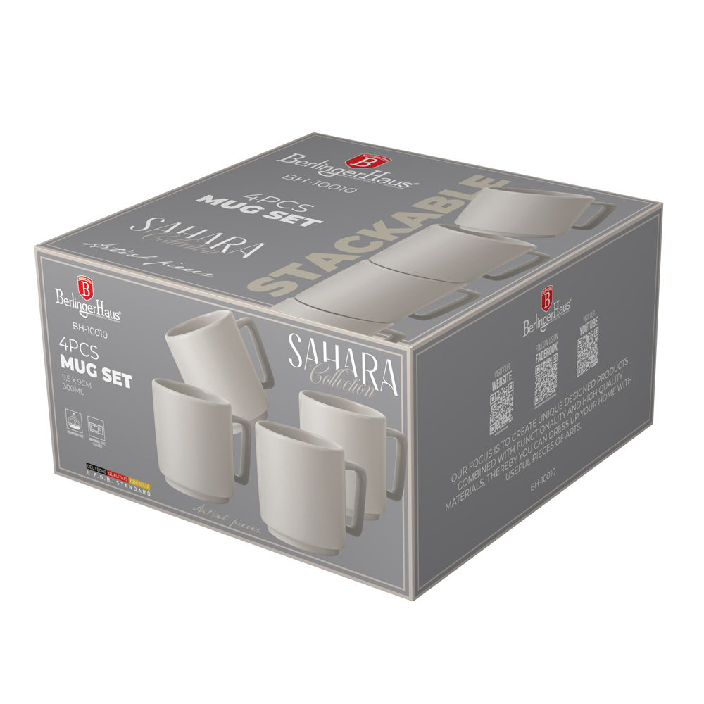 Berlinger Haus Sahara-krussettet kombinerer elegant design med solid kvalitet. Settet består av fire krus på 300 ml, laget av høykvalitets steintøy og ferdig i en eksklusiv matt Saharas. Perfekt for kaffe, te eller kakao – enten hjemme eller på jobb.