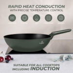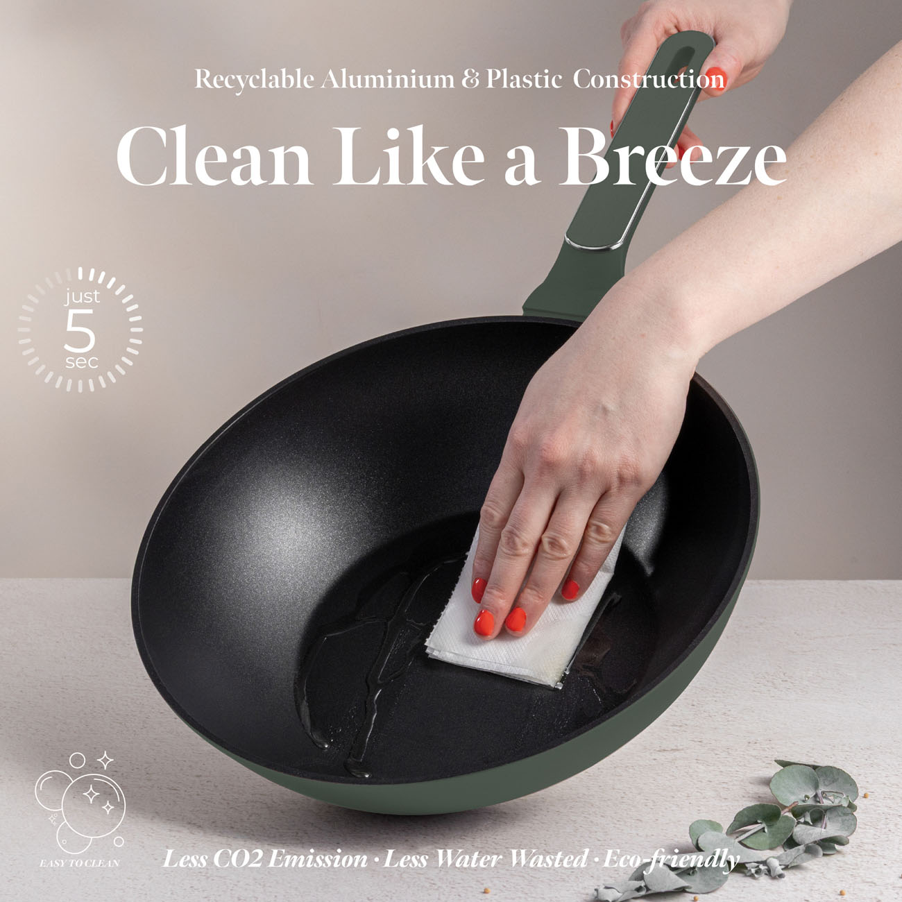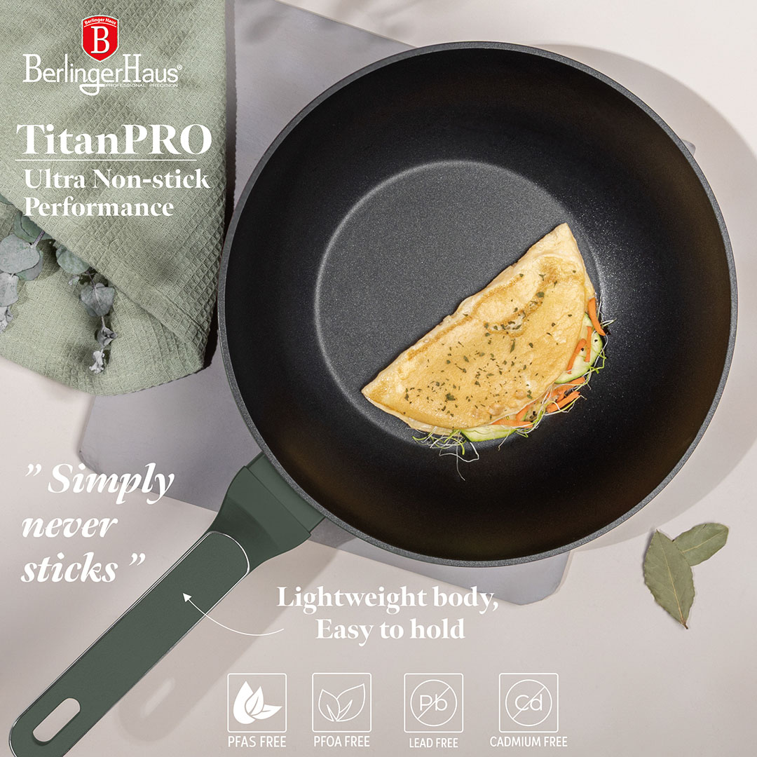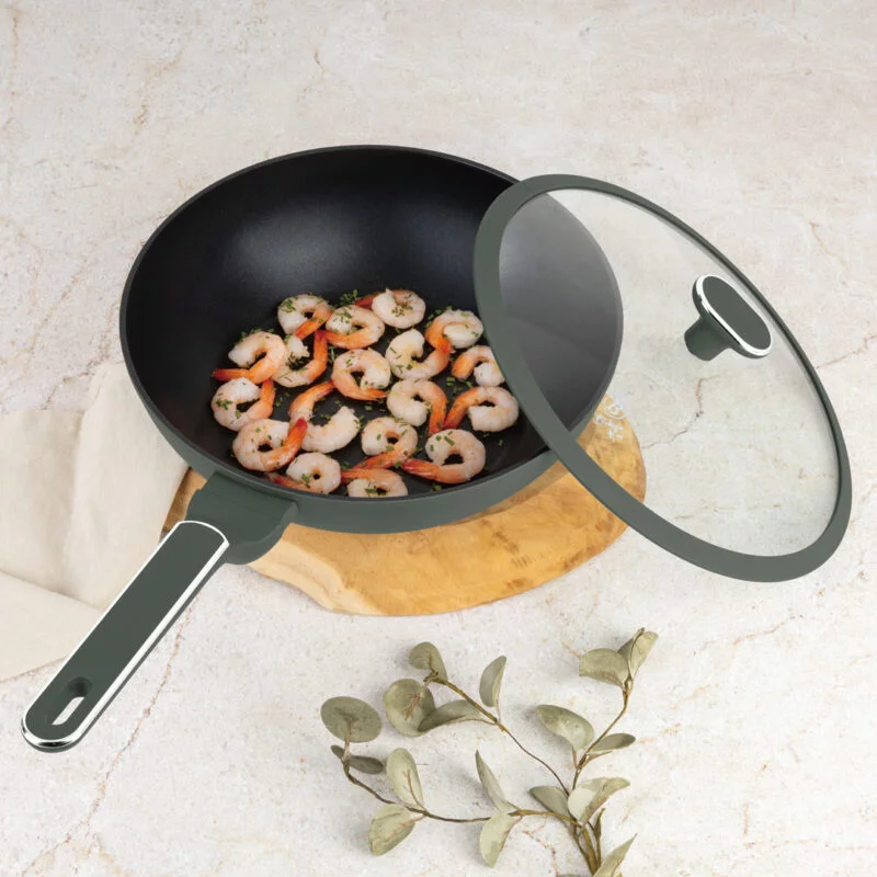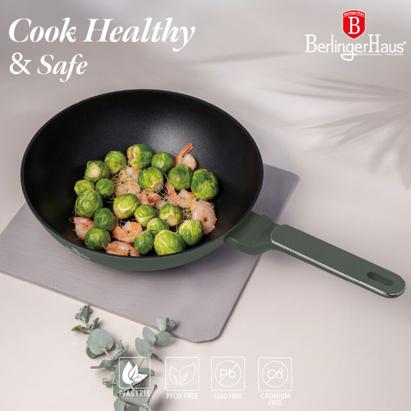 Berlinger Haus BH8159 er en stilren og funksjonell wokpanne i matt grønn finish, perfekt til wok, sautering, damping og én-panne-retter. Med 28 cm diameter og 3,2 L kapasitet passer den utmerket til både hverdags- og familiemat.