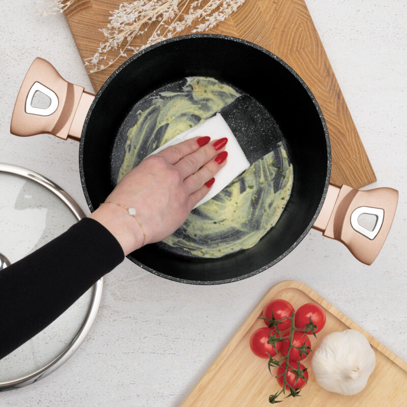Den 3-lags marmorinspirerte non-stick-belegningen gjør at maten ikke setter seg fast – og gjør rengjøringen enkel og rask.