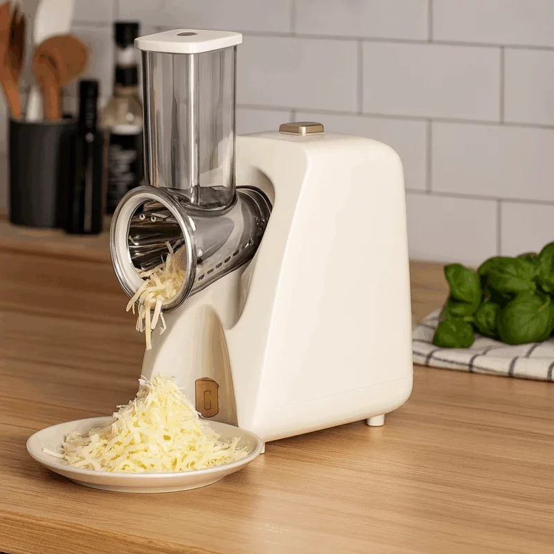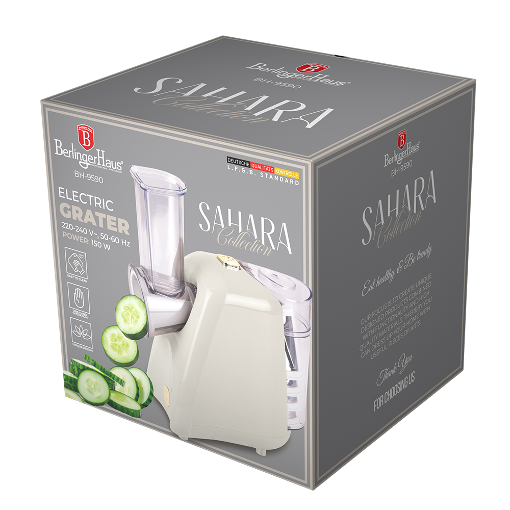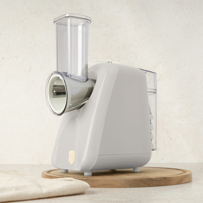 Gjør matlaging enklere, raskere og sunnere med Berlinger Haus BH9590 Sahara Elektrisk Salatmaskin. Denne stilrene maskinen i kremfarge skjærer, river og strimler grønnsaker, frukt, ost og mye mer – perfekt for alt fra salater og tilbehør til dessertdekorasjoner.