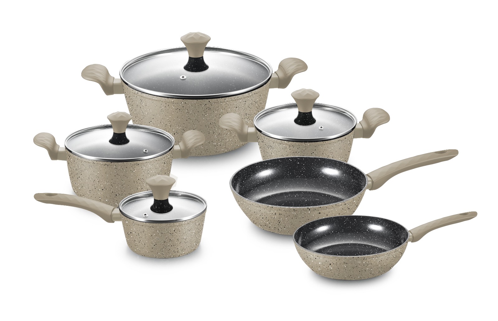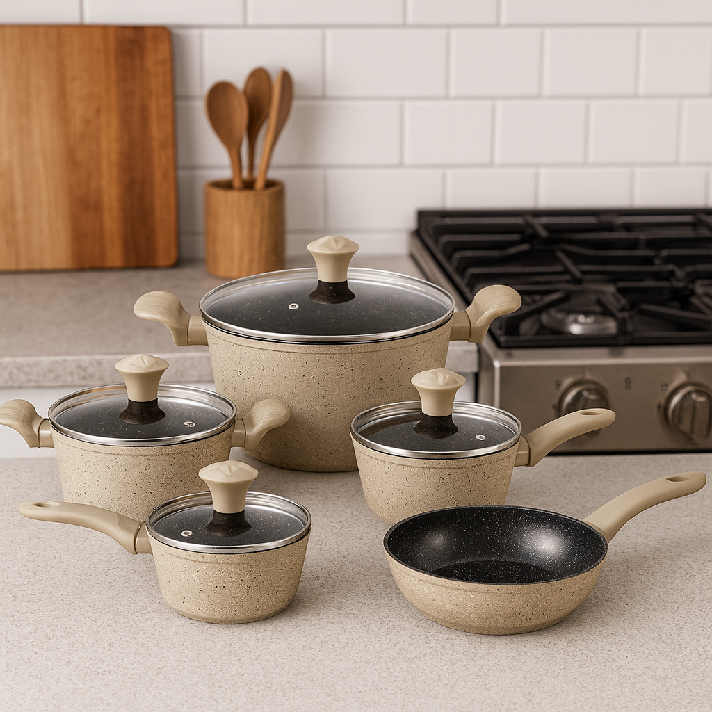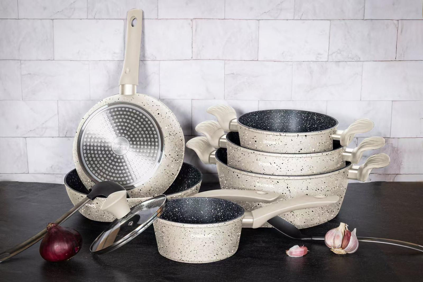 Royalty Line 10-delt Grytesett – Støpt Aluminium med Marmorbelegg, Beige