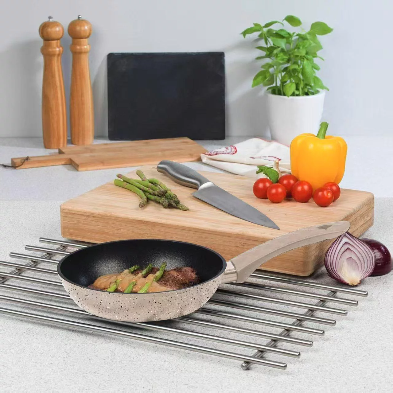 - Non-stick marmorbelegg – Gir sunnere matlaging uten at maten fester seg, og gjør rengjøring superenkel.