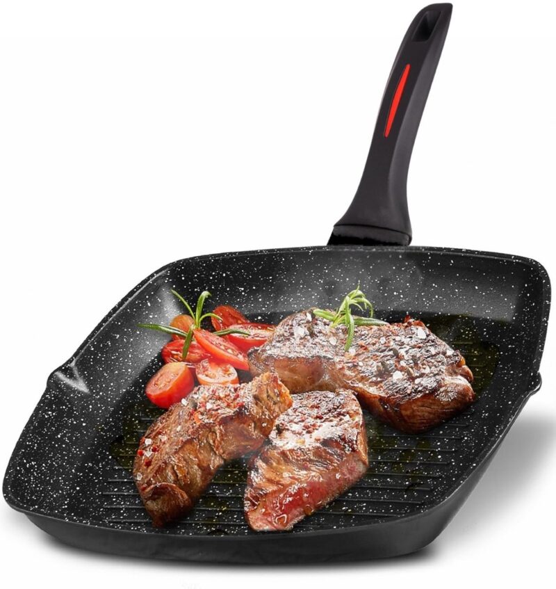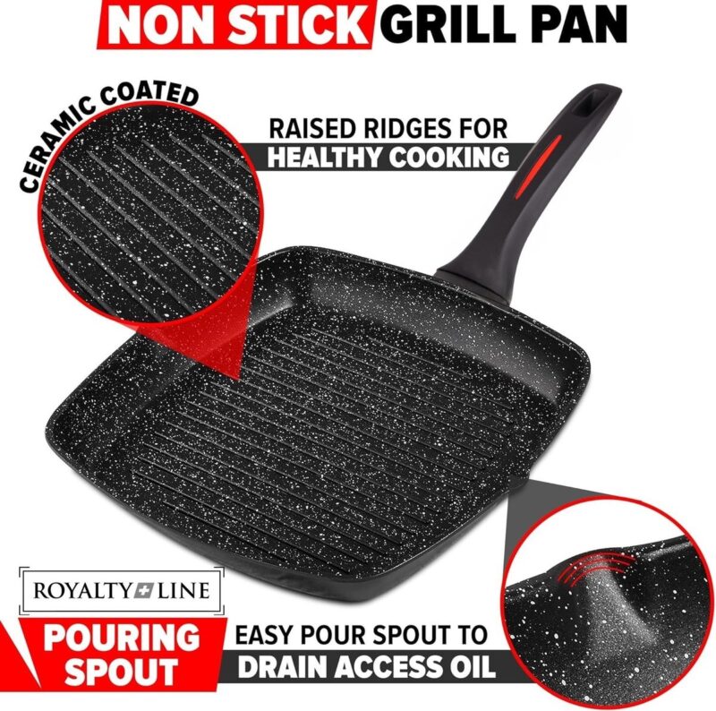 Grillpannen fra Royalty Line er laget av solid aluminium, noe som gir lang levetid. Den har et slitesterkt non-stick belegg som gjør pannen motstandsdyktig mot riper, og den vil verken ruste eller deformeres – selv etter mange års daglig bruk.