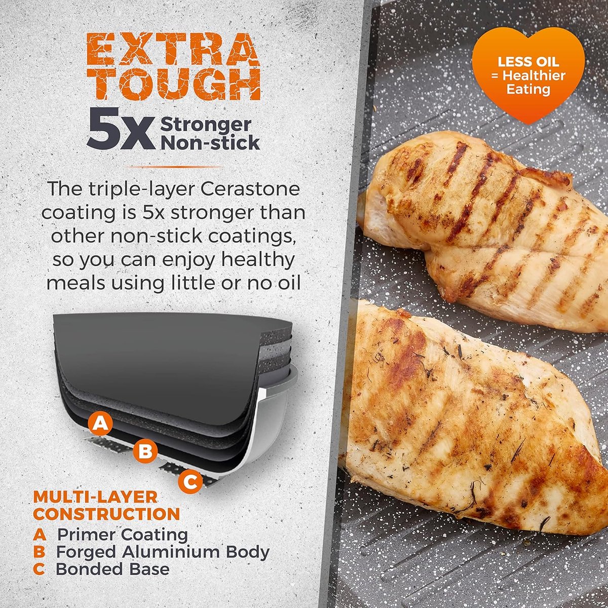 Drypppannen fjerner overflødig fett, og det slitesterke non-stick belegget gjør at du kan bruke minimalt med olje.