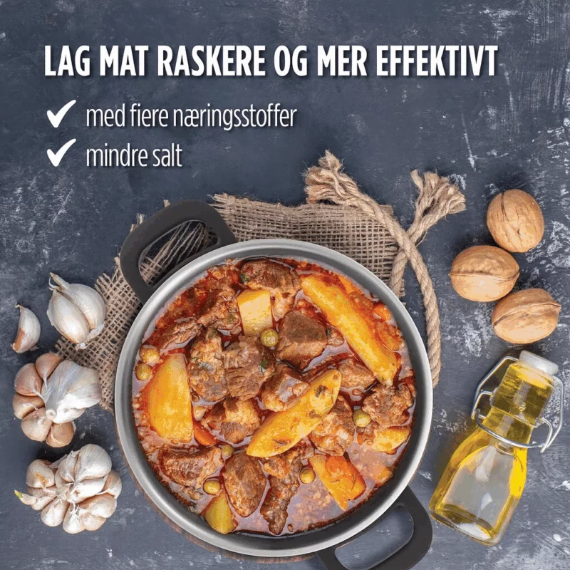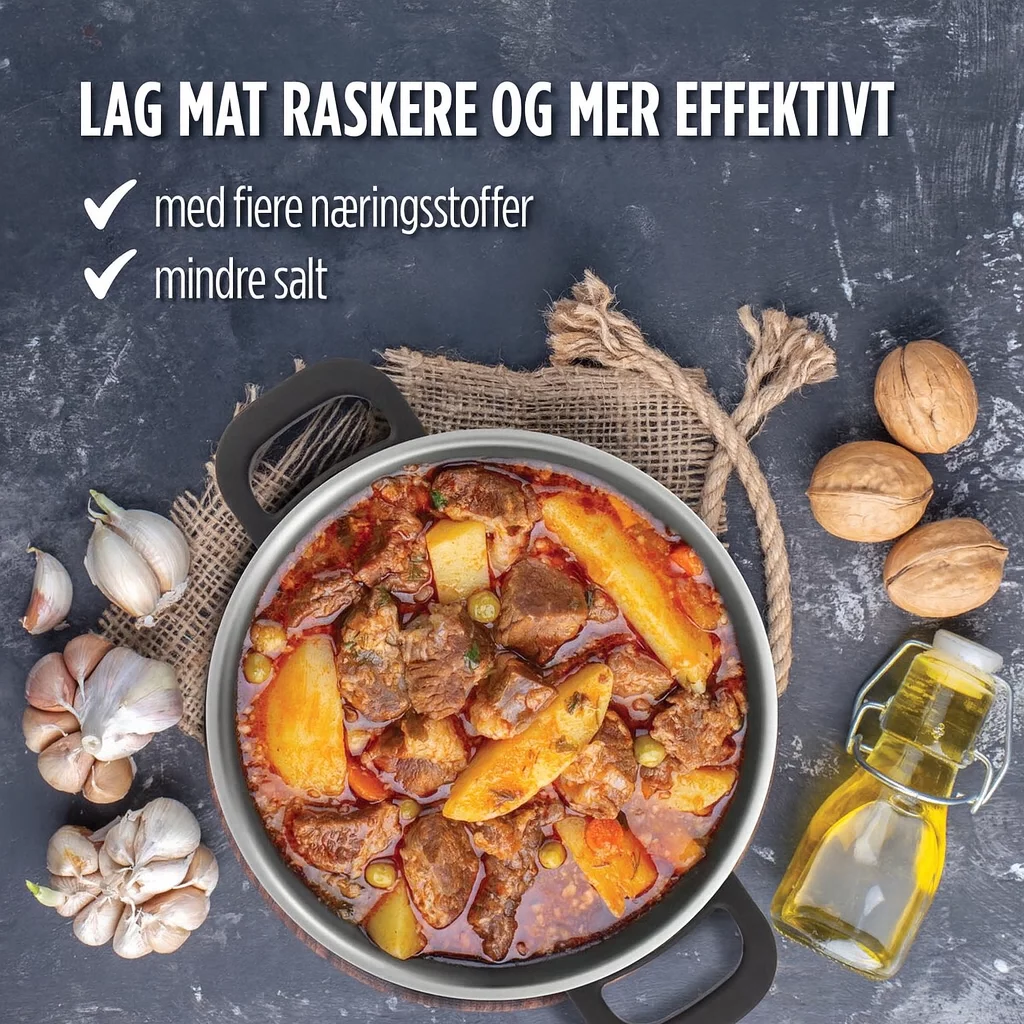 - Sidehåndtak: Gir sikker og enkel håndtering under matlaging.